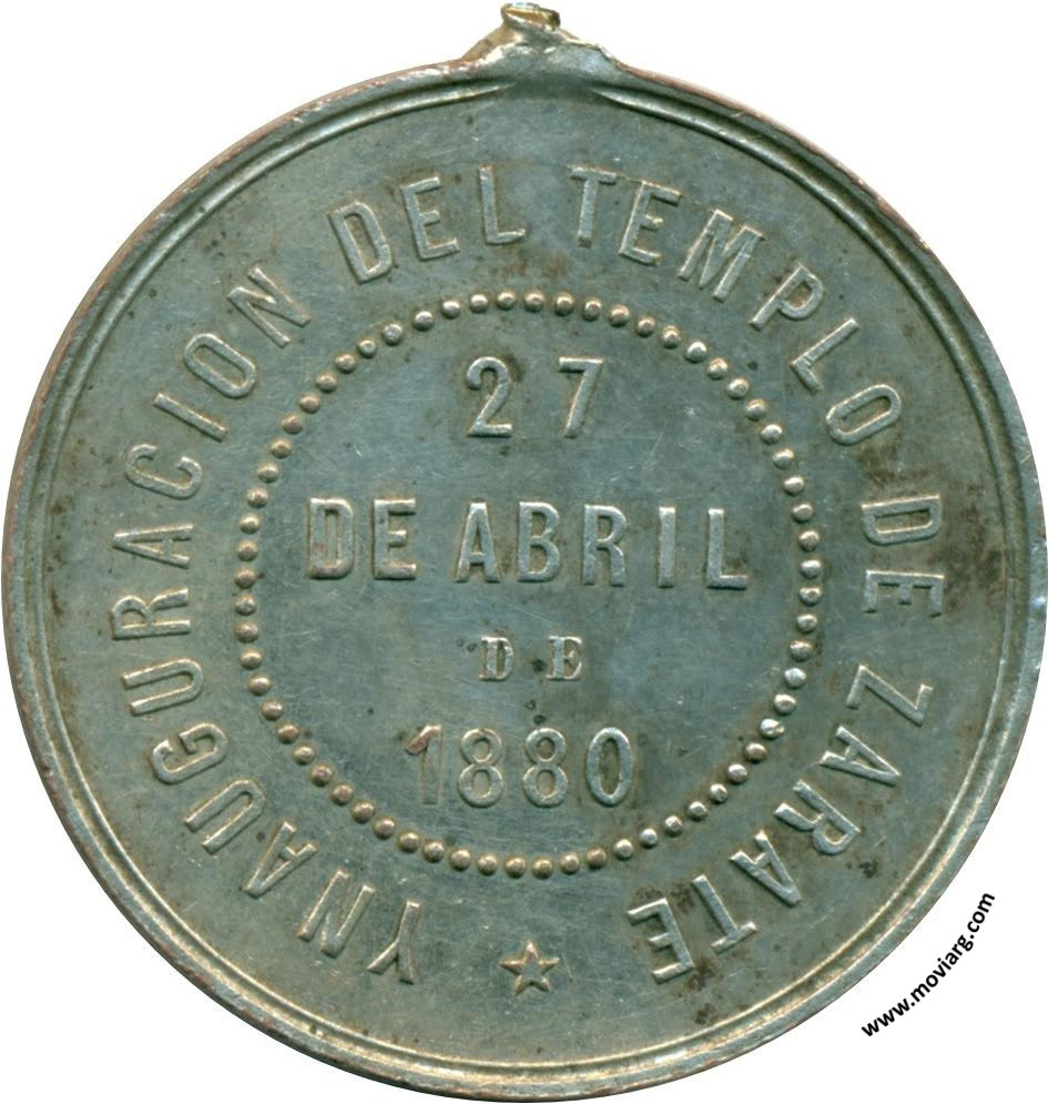 Anverso: YNAUGURACION (sic) / DEL TEMPLO DE ZARATE / 27 / DE ABRIL / DE / 1880 Reverso: EN COMMEMORACION (sic) / DE ESTE / GRAN DIA / JUAN E. MORIS / Á / SUS AMIGOS Referencia: | |