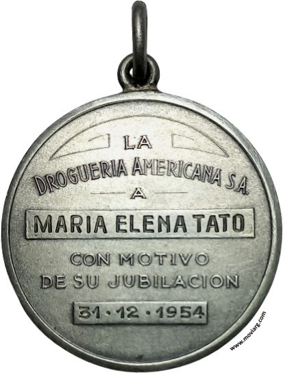 Colección MDS Anverso:Reverso: LA / DROGUERIA AMERICANA S.A. / A / [ MARIA ELENA TATO ] / CON MOTIVO / DE SU JUBILACION / [ 31·12·1954 ] Canto: Liso. 900 Referencia: | |