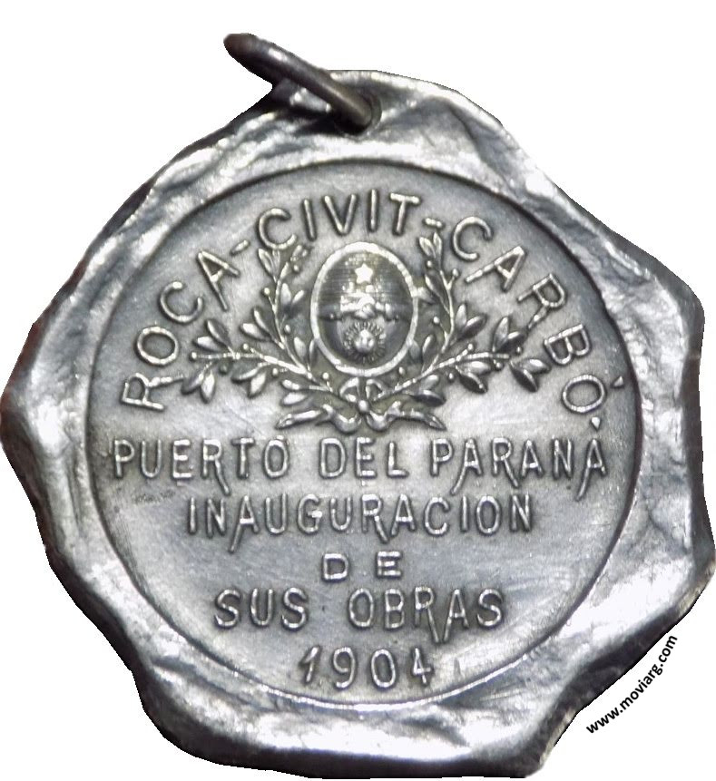 Colección Nicolás Pittavino Anverso: Firma: BELLAGAMBA Y ROSSIReverso: ROCA - CIVIT - CARBÓ / PUERTO DE PARANÁ / INAUGURACION / DE / SUS OBRAS / 1904 Referencia: | |