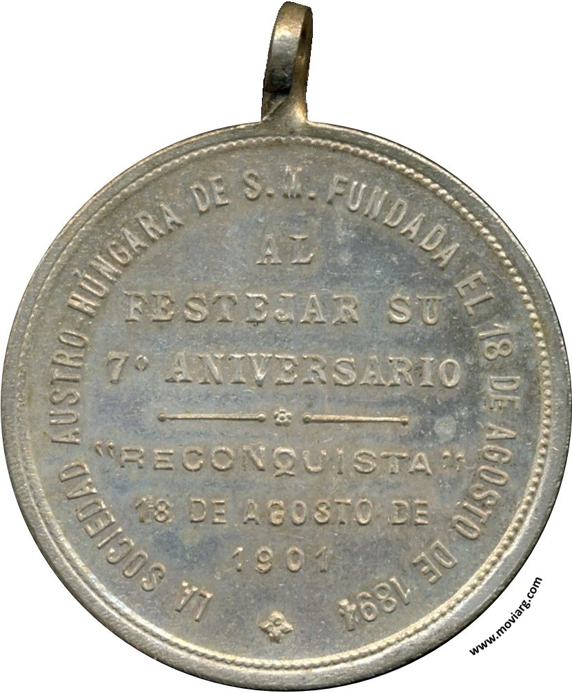 Anverso: 1830 - NATALICIO DE S. M. FRANCISCO JOSÉ I EMPERADOR Y REY - 1901 / SOCIEDAD AUSTRO-HÚNGARA FESTEJANDO EL ANIVERSARIO DE SU MONARCA. Firma: B. Y R. Reverso: LA SOCIEDAD AUSTRO-HÚNGARA DE S. M. FUNDADA EL 18 DE AGOSTO DE 1894 / AL / FESTEJAR SU / 7° ANIVERSARIO / " RECONQUISTA " / 18 DE AGOSTO DE / 1901 Referencia: | |