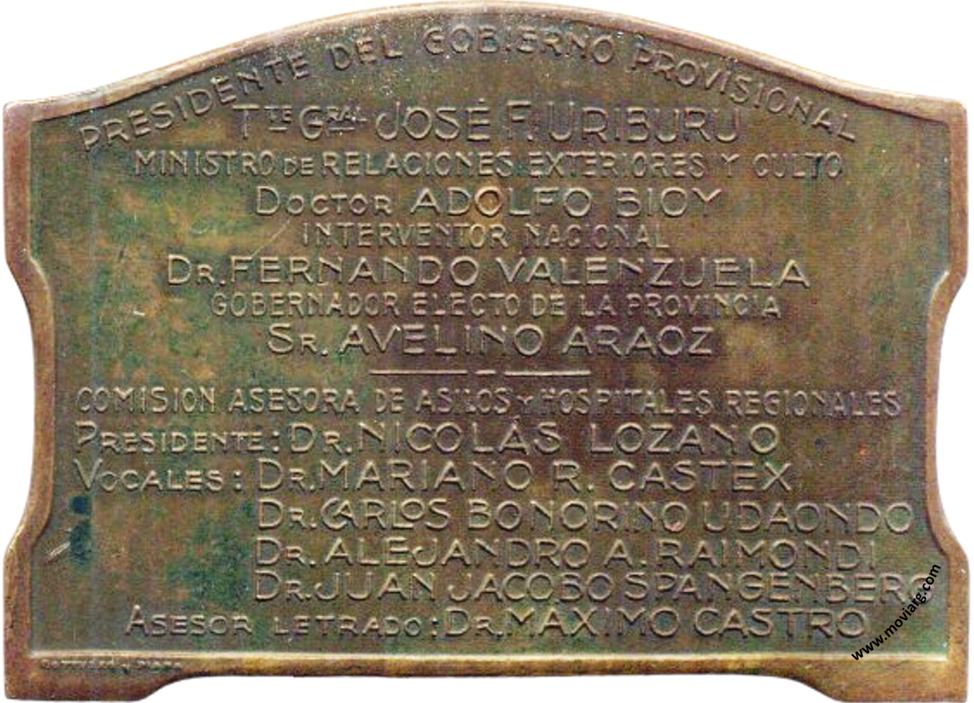 Anverso: PIEDRA FUNDAMENTAL / DE LA COLONIA NACIONAL / NEURO PSIQUIATRICA DEL NORTE / ROSARIO DE LERMA PROV. DE SALTA / FEBRERO - 14 DE 1932 Reverso: PRESIDENTE DEL GOBIERNO PROVISIONAL / TTE. GRAL. JOSÉ F. URIBURU / MINISTRO DE RELACIONES EXTERIORES Y CULTO / DOCTOR ADOLFO BIOY / INTERVENTOR NACIONAL / DR. FERNANDO VALENZUELA / GOBERNADOR ELECTO DE LA PROVINCIA / DR. AVELINO ARAOZ / COMISION ASESORA DE ASILOS Y HOSPITALES REGIONALES / PRESIDENTE: DR. NICOLÁS LOZANO / VOCALES: DR. MARIANO R. CASTEX / DR. CARLOS BONORINO UDAONDO / DR. ALEJANDRO A. RAIMONDI / DR. JUAN JACOBO SPANGENBERG / ASESOR LETRADO: DR. MAXIMO CASTRO. Firma: GOTTUZZO Y PIANA Referencia: | |