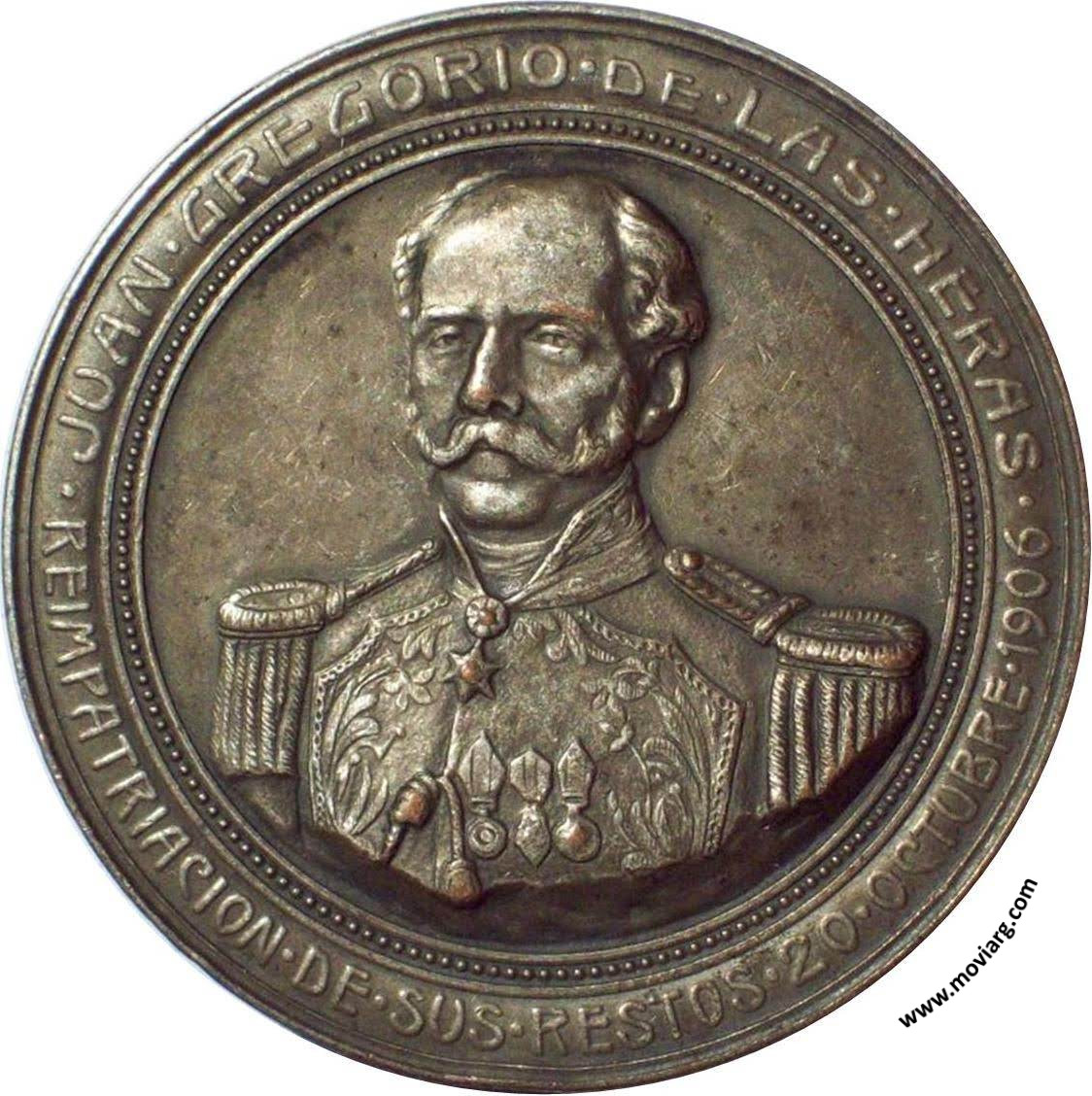 Anverso: JUAN GREGORIO DE LAS HERAS / REIMPATRIACION DE SUS RESTOS 20 OCTUBRE 1906 Reverso: NACIO EN BUENOS AIRES 11 JULIO 1780 / MURIO EN SANTIAGO DE CHILE 6 FEBRERO 1866 / ORLARON SU FRENTE DE GUERRERO / LOS LAURELES DE / CUCHA CUCHA 22 FEBRERO 1814 / MEMBRILLAR 20 MARZO 1814 / TRES MONTES PASO DEL RIO CLARO / Y QUECHEREGUAS 1814 / GUARDIA VIEJA 4 FEBRERO 1817 / CHACABUCO 12 FEBRERO 1817 / CURAPALIGUE 4 ABRIL 1814 / GAVILAN 5 MAYO 1817 / TALCAHUANO 7 DICIEMBRE 1917 / CANCHA RAYADA 19 MARZO 1818 / MAIPU 5 ABRIL 1818 / SITIO Y ASALTO DEL CALLAO / JULIO Y AGOSTO 1821 / GOBERNADOR DE BS. AIRES Y ENCARGADO / DEL PODER EJECUTIVO NACIONAL / DE LA REP. ARGENTINA / 1824 - 1825. Firma: E MUELLER ESC. / GOTTUZZO GRA. Referencia: | |