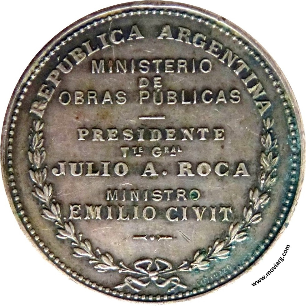 | Año: 1904 Obras y Servicios Públicos Metal: Plateado - Módulo: 40mm Grabador: Juan Gottuzzo | |