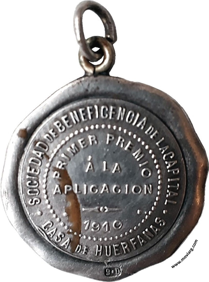 Anverso: Reverso: SOCIEDAD DE BENEFICENCIA DE LA CAPITAL / CASA DE HUERFANAS / PRIMER PREMIO / Á LA / APLICACION / 1910. Exergo: [ 9 · D ] Referencia: | |