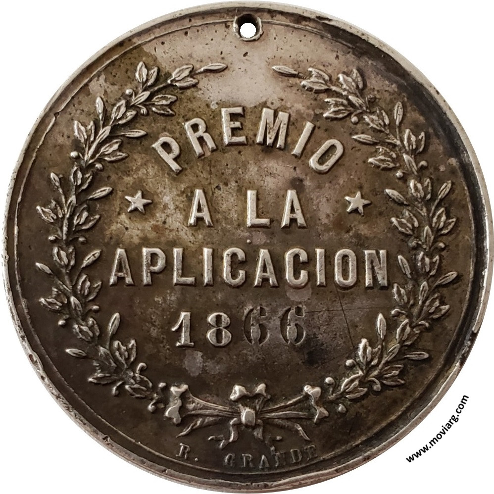 | Año: (1866) Premio al Mérito y Aplicación Metal: Plata - Peso: 18.25gr - Módulo: 32.52mm - Espesor: 2.6mm - Rotación: 12hrs Grabador: Rosario Grande | |