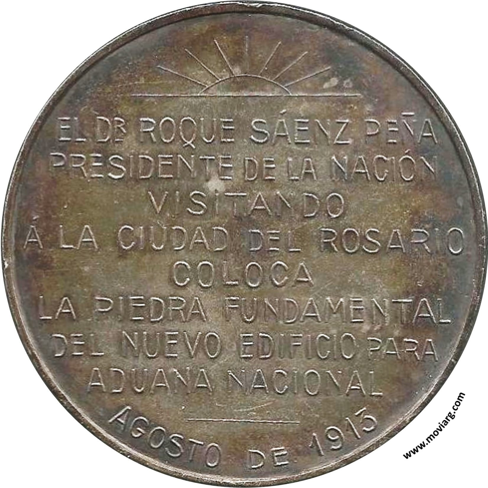 Anverso: DOCTOR ROQUE / SAENZ PEÑA Reverso: EL DR. ROQUE SÁENZ PEÑA / PRESIDENTE DE LA NACIÓN / VISITANDO / Á LA CIUDAD DEL ROSARIO / COLOCA / LA PIEDRA FUNDAMENTAL / DEL NUEVO EDIFICIO PARA / ADUANA NACIONAL / AGOSTO DE 1913 Referencia: | |