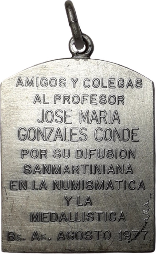 Anverso: SAN MARTIN!..... Reverso: AMIGOS Y COLEGAS / AL PROFESOR / JOSE MARIA / GONZALES CONDE / POR SU DIFUSION / SANMARTINIANA / EN LA NUMISMATICA / Y LA / MEDALLISTICA / BS. AS. AGOSTO 1977. Firma: A.N.A. Referencia: | |
