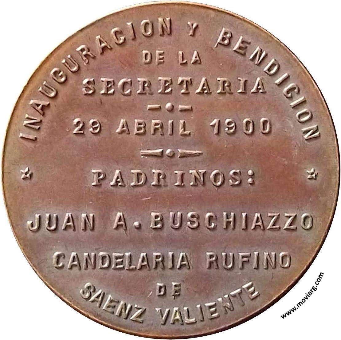 Anverso: SOCIEDAD DE BENEFICENCIA / HERMANAS DE LOS DESAMPARADOS Reverso: INAUGURACION Y BENDICION / DE LA / SECRETARIA / 29 ABRIL 1900 / PADRINOS : / JUAN A. BUSCHIAZZO / CANDELARIA RUFINO / DE / SAENZ VALIENTE Canto: Humberto Burzio: "Buenos Aires en la medalla" 1981 p1016. Referencia: BURZIO-3208 | |