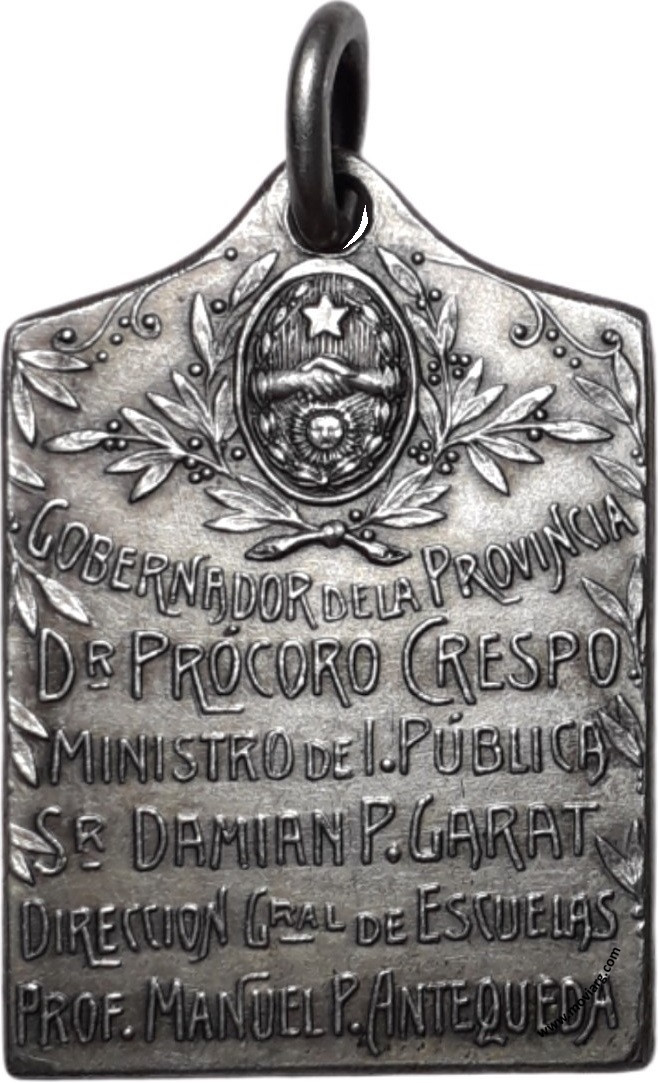 Colección MDS Anverso: ESCUELA SUPERIOR / LAPRIDA / INAUGURACION / DE SU EDIFICIO / 24 DE MAYO DE 1914. Firma: GOTTUZZO Y CA.Reverso: GOBERNADOR DE LA PROVINCIA / DR. PRÓCORO CRESPO / MINISTRO DE I. PÚBLICA / SR. DAMIAN P. GARAT / DIRECCION GRAL. DE ESCUELAS / PROF. MANUEL P. ANTEQUEDA Canto: Liso. PLATA Referencia: | |
