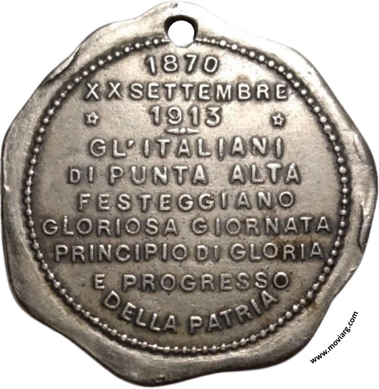 Colección @parryyanumismatico Anverso: Campo: S.P.Q.R.Reverso: 1870 / XX SETTEMBRE / 1913 / GL'ITALIANI / DI PUNTA ALTA / FESTEGGIANO / GLORIOSA GIORNATA / PRINCIPIO DI GLORIA / E PROGRESSO / DELLA PATRIA Referencia: | |