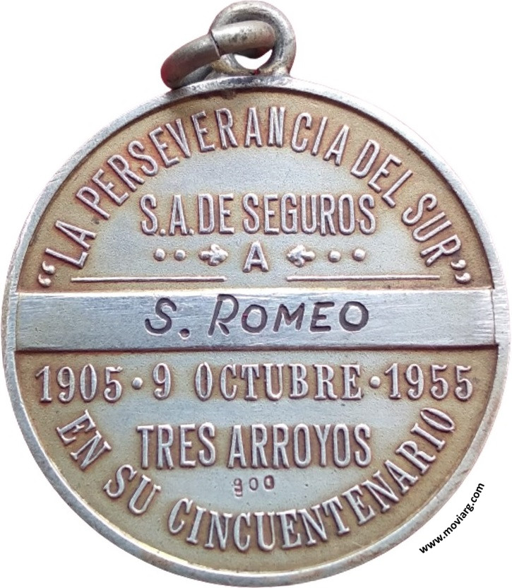 Anverso: Reverso: " LA PERSEVERANCIA DEL SUR " / S.A. DE SEGUROS / A / [ S. ROMEO ] / 1905 · 9 OCTUBRE · 1955 / EN SU CINCUENTENARIO / TRES ARROYOS. Campo: [ 900 ] Referencia: | |