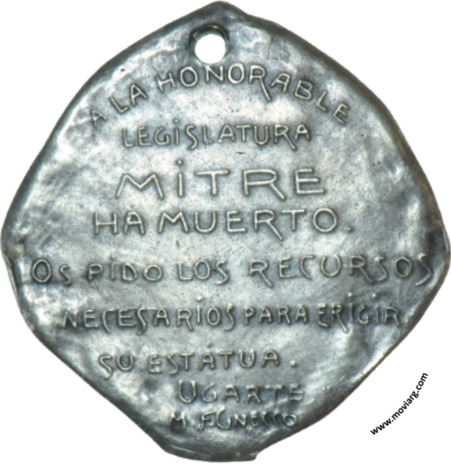 Anverso: HOMENAJE A MITRE / PCIA. DE BUENOS AIRES / 26 - 6 - 1821 · 19 - 1 - 1906. Firma: ESC. / A. DRESCO Reverso: A LA HONORABLE / LEGISLATURA / MITRE / HA MUERTO. / OS PIDO LOS RECURSOS / NECESARIOS PARA ERIGIR / SU ESTATUA / UGARTE / M. FUNECCO. Firma: A. COSTA HUGUET Referencia: | |