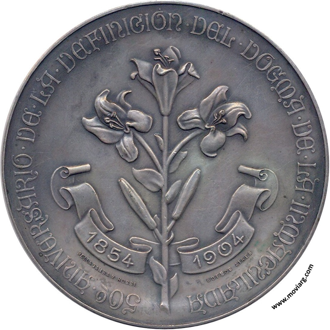 Anverso: Reverso: 50° ANIVERSARIO DE LA DEFINICIÓN DEL DOGMA DE LA INMACULADA. Campo: 1854 / 1904. Firma: BELLAGAMBA Y ROSSI / BUENOS AIRES Referencia: | |