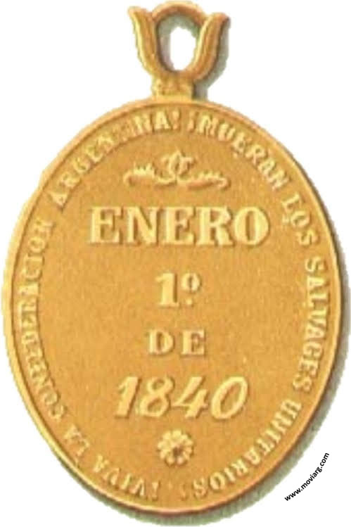 Anverso: ENERO / 1° / DE / 1840 / ¡ VIVA LA CONFEDERACION ARGENTINA ! ¡ MUERAN LOS SALVAGES UNITARIOS ! Reverso: LA / PROVINCIA / DE / ENTRE - RIOS / A LA / FIDELIDAD / Y AL / HEROISMO Referencia: | |
