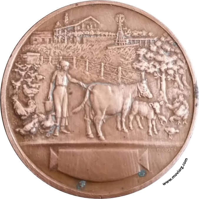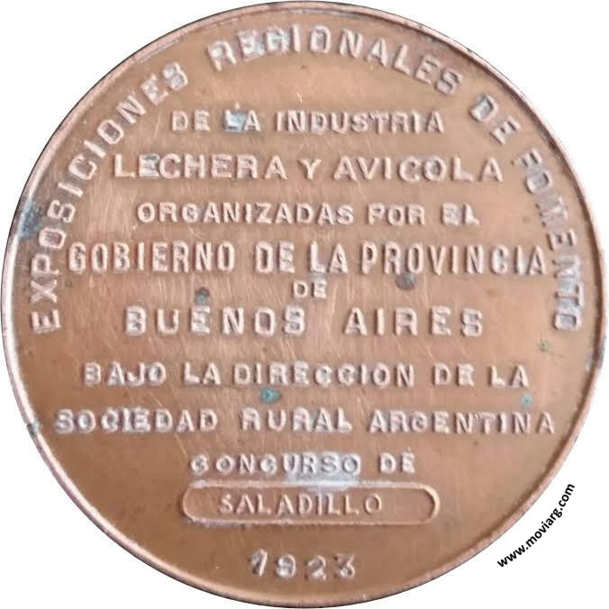 Anverso: Firma: F. COSTA Reverso: EXPOSICIONES REGIONALES DE FOMENTO / DE LA INDUSTRIA / LECHERA Y AVICOLA / ORGANIZADAS POR EL / GOBIERNO DE LA PROVINCIA / DE / BUENOS AIRES / BAJO LA DIRECCION DE LA / SOCIEDAD RURAL ARGENTINA / CONCURSO DE / SALADILLO / 1923 Referencia: | |