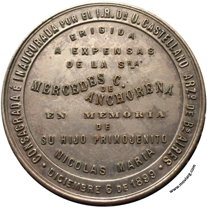Anverso: IGLESIA DE LA I. CONCEPCION DEL / SEMINARIO C. DE BUENOS AIRES / VILLA DEVOTO Reverso: CONSAGRADA É INAUGURADA POR EL I.R. DR. U. CASTELLANO ARZO. DE BS. AIRES / DICIEMBRE 6 DE 1899 / ERIGIDA / A EXPENSAS / DE LA SRA. / MERCEDES C. / DE / ANCHORENA / EN MEMORIA / DE / SU HIJO PRIMOJENITO / NICOLAS MARIA Referencia: | |