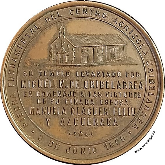 Anverso: MAXIMO PAZ PADRINO / ANA OLAGUER FELIU Y AZUENAGA MADRINA / PROVINCIA DE BUENOS AIRES / GOBERNADOR / JULIO A. COSTA / ARQUITECTO - PEDRO J. BENOIT Reverso: PIEDRA FUNDAMENTAL DEL CENTRO AGRICOLA URIBELARREA / 8 DE JUNIO 1890 / SU TEMPLO LEVANTADO POR / MIGUEL N. DE URIBELARREA / EN HOMENAJE A LAS VIRTUDES / DE SU FINADA ESPOSA / MANUELA OLAGUER FELIU / Y AZCUENAGA. Firma: J.D. Referencia: | |