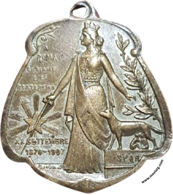 Anverso: A / ROMA / CI SIAMO / E CI / RESTEREMO / XX SETTEMBRE / 1870 - 1907. Firma: A. BIDOGLIA. Campo: S.P.Q.R. Reverso: RICORDO / DEL / COMITATO / DELLE SOCIETÁ / UNIONE E FRATELLANZQA / AMORE E CARITA / CIRCOLO NAPOLITANO / SCUOLE ITALIANE / ITALIA UNITA / FRATELLANZA COSENTINA / PRINCIPESSA YOLANDA / E DANTE ALIGHIERI / LA PLATA Referencia: | |