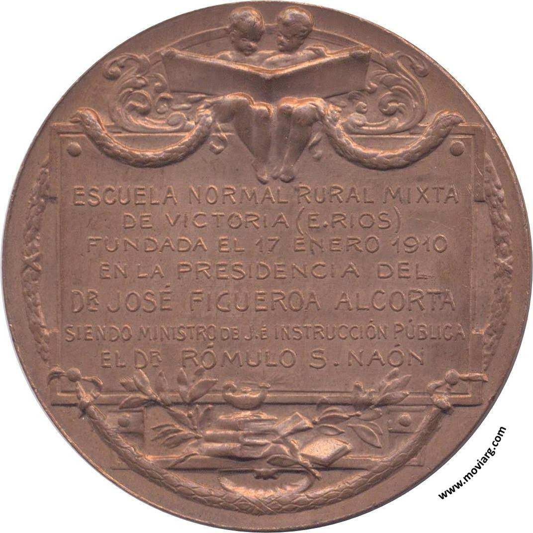 Anverso: Reverso: ESCUELA NORMAL RURAL MIXTA / DE VICTORIA ( E. RIOS ) / FUNDADA EL 17 DE ENERO 1910 / EN LA PRESIDENCIA DEL / DR. JOSÉ FIGUEROA ALCORTA / SIENDO MINISTRO DE J. É INSTRUCCIÓN PÚBLICA / EL DR. RÓMULO S. NAÓN Referencia: | |