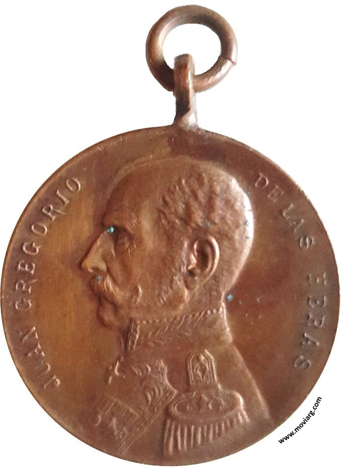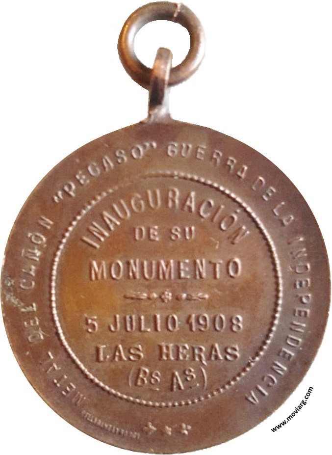 Anverso: JUAN GREGORIO / DE LAS HERAS Reverso: METAL DEL CAÑON " PEGASO " GUERRA DE LA INDEPENDENCIA / INAUGURACION / DE SU / MONUMENTO / 5 JULIO 1908 / LAS HERAS / BS. AS. Firma: BELLAGAMBA Y ROSSI Referencia: | |