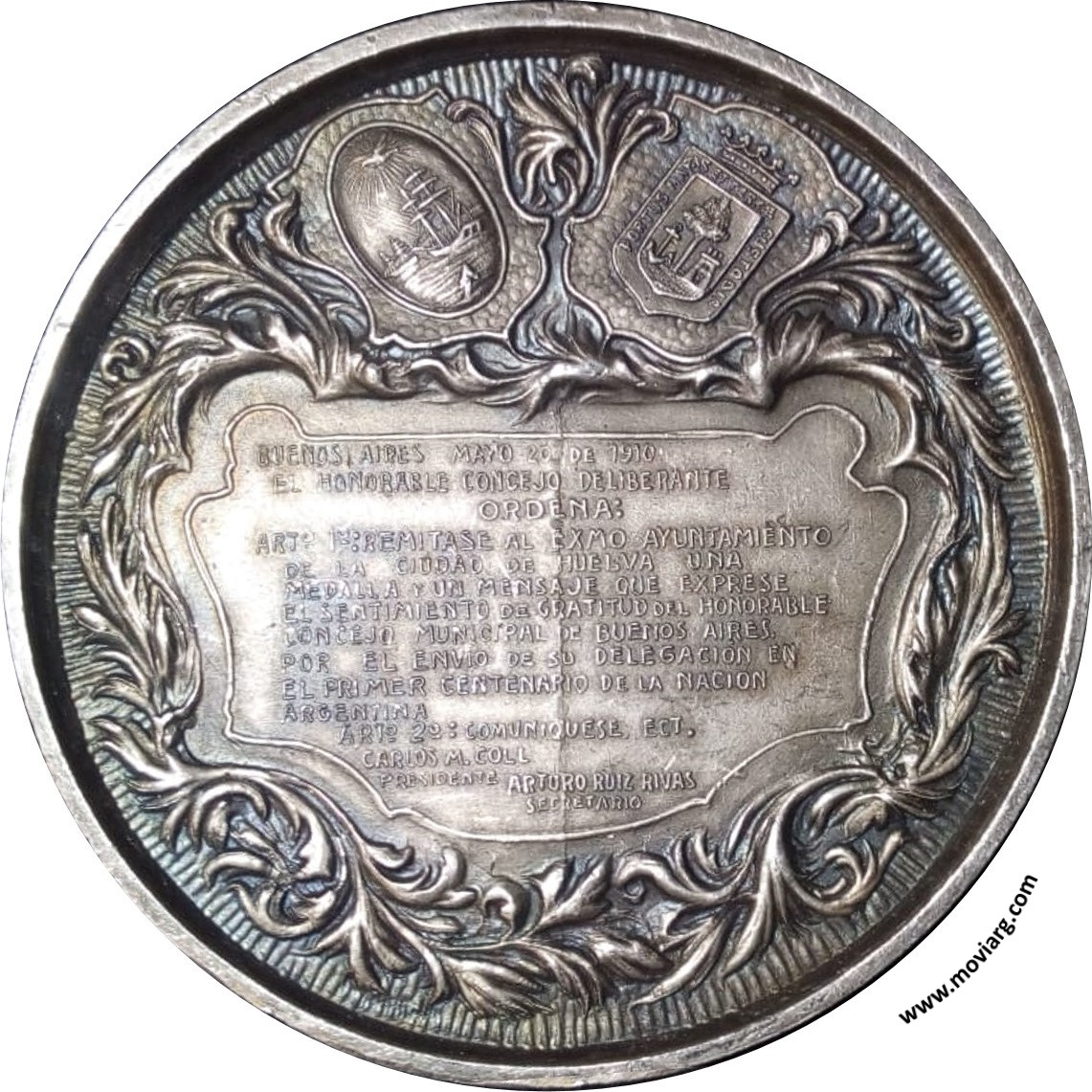 Anverso: 1810 · 25 · DE / MAYO · 1910. Firma: HORTA Y CIA. Reverso: BUENOS AIRES MAYO 20 DE 1910 / EL HONORABLE CONCEJO DELIBERANTE / ORDENA : / ART° 1°: REMITASE AL EXMO. AYUNTAMIENTO / DE LA CIUDAD DE HUELVA UNA / MEDALLA Y UN MENSAJE QUE EXPRESE / EL SENTIMIENTO DE GRATITUD DEL HONORABLE / CONCEJO MUNICIPAL DE BUENOS AIRES. / POR EL ENVIO DE SU DELEGACION EN / EL PRIMER CENTENARIO DE LA NACION / ARGENTINA / ART° 2° COMUNIQUESE ETC. / CARLOS M COLL / PRESIDENTE / ARTURO RUIZ RIVAS / SECRETARIO Canto: Liso. PLATA (?) Referencia: | |