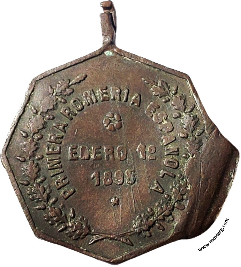 | Año: 1895 Romerías Metal: Cobre - Peso: 8.39gr - Módulo: 26.85x34.69mm - Espesor: 2.01mm - Rotación: 12hrs Grabador: Ignacio Orzali, José Bellagamba y Constante Rossi | |