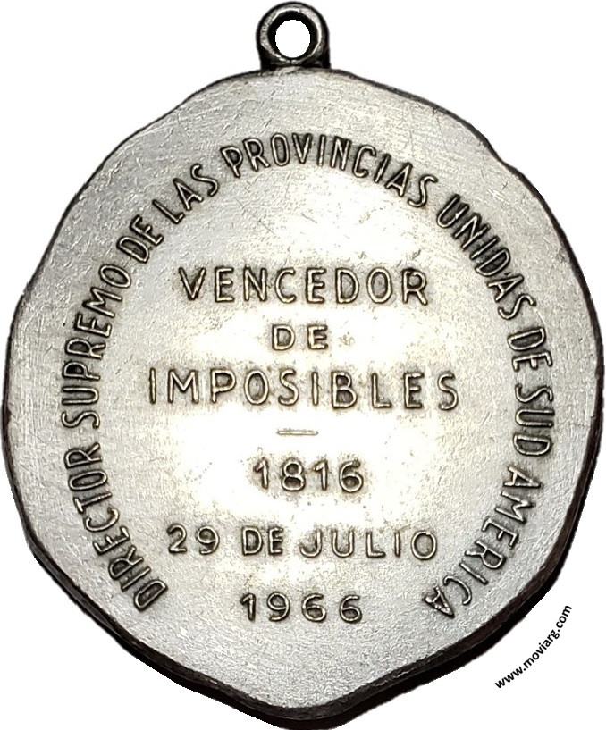 Anverso: JUAN MARTIN DE PUEYRREDON / 1776 / 1850 Reverso: DIRECTOR SUPREMO DE LAS PROVINCIAS UNIDAS DE SUD AMERICA / VENCEDOR / DE / IMPOSIBLES / 1816 / 29 DE JULIO / 1966 Referencia: | |