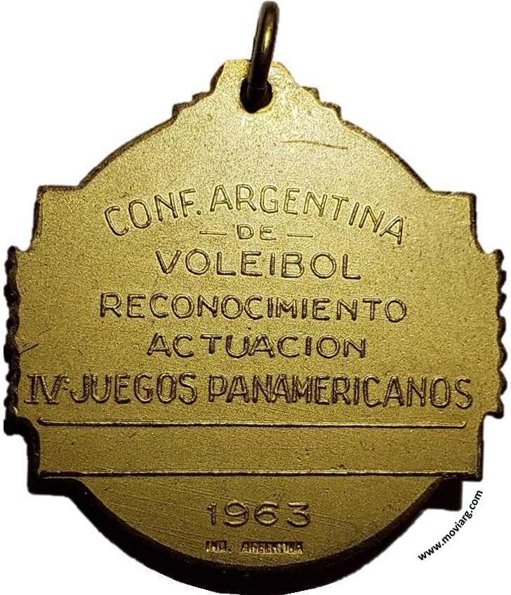 Anverso: Reverso: CONF. ARGENTINA / DE / VOLEIBOL / RECONOCIMIENTO / ACTUACION / IV JUEGOS PANAMERICANOS / 1963. Exergo: [ IND. ARGENTINA ] Referencia: | |