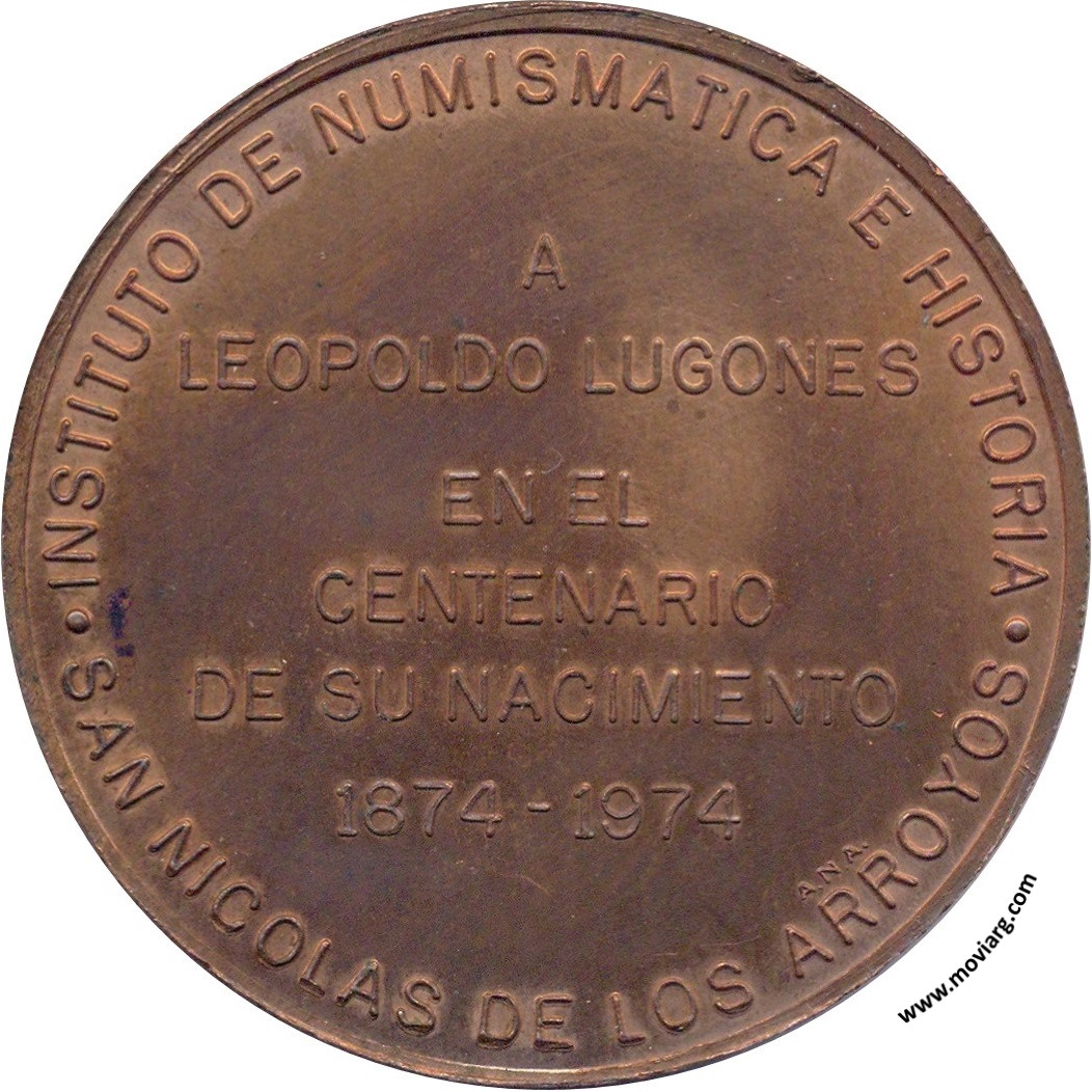 Anverso: LEOPOLDO LUGONES Reverso: INSTITUTO DE NUMISMATICA E HISTORIA / SAN NICOLAS DE LOS ARROYOS / A / LEOPOLDO LUGONES / EN EL / CENTENARIO / DE SU NACIMIENTO / 1874 - 1974. Exergo: A.N.A. Referencia: | |