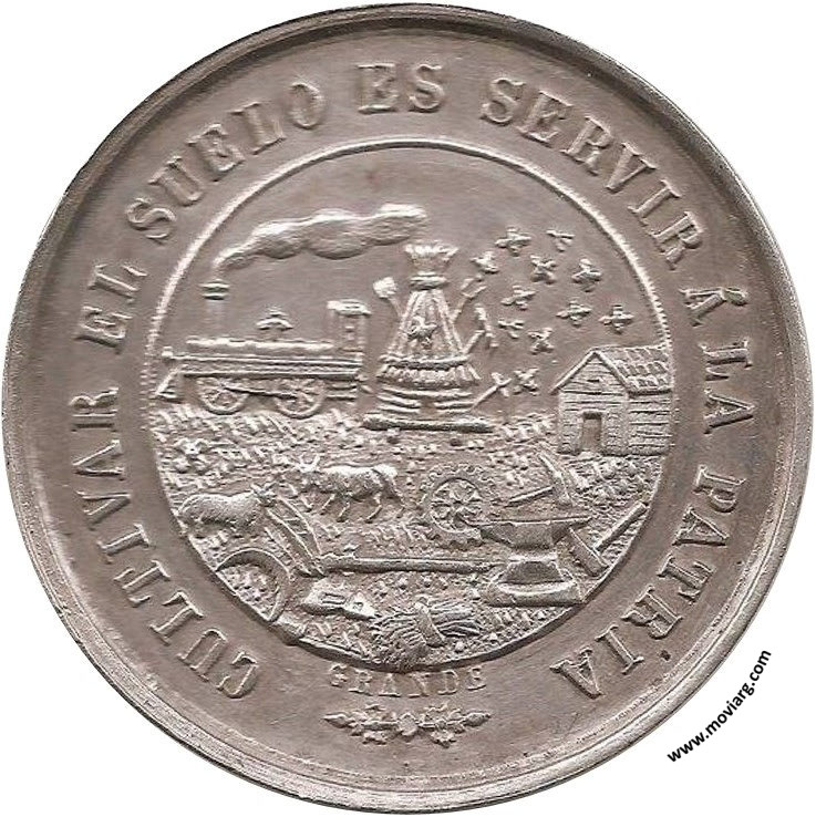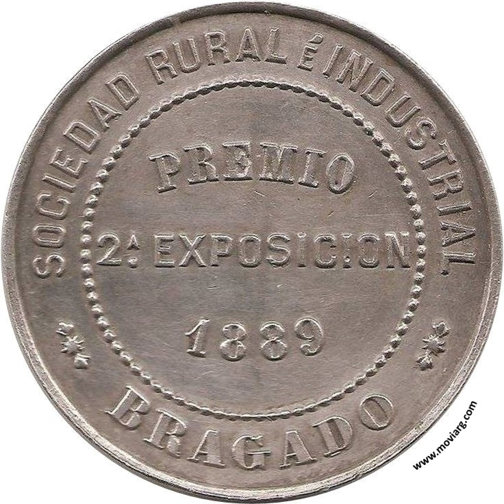 Anverso: CULTIVAR EL SUELO ES SERVIR Á LA PATRIA. Firma: GRANDE Reverso: SOCIEDAD RURAL É INDUSTRIAL / PREMIO / 2A. EXPOSICION / 1889 / BRAGADO Referencia: FERRARI-175 (RG) | |
