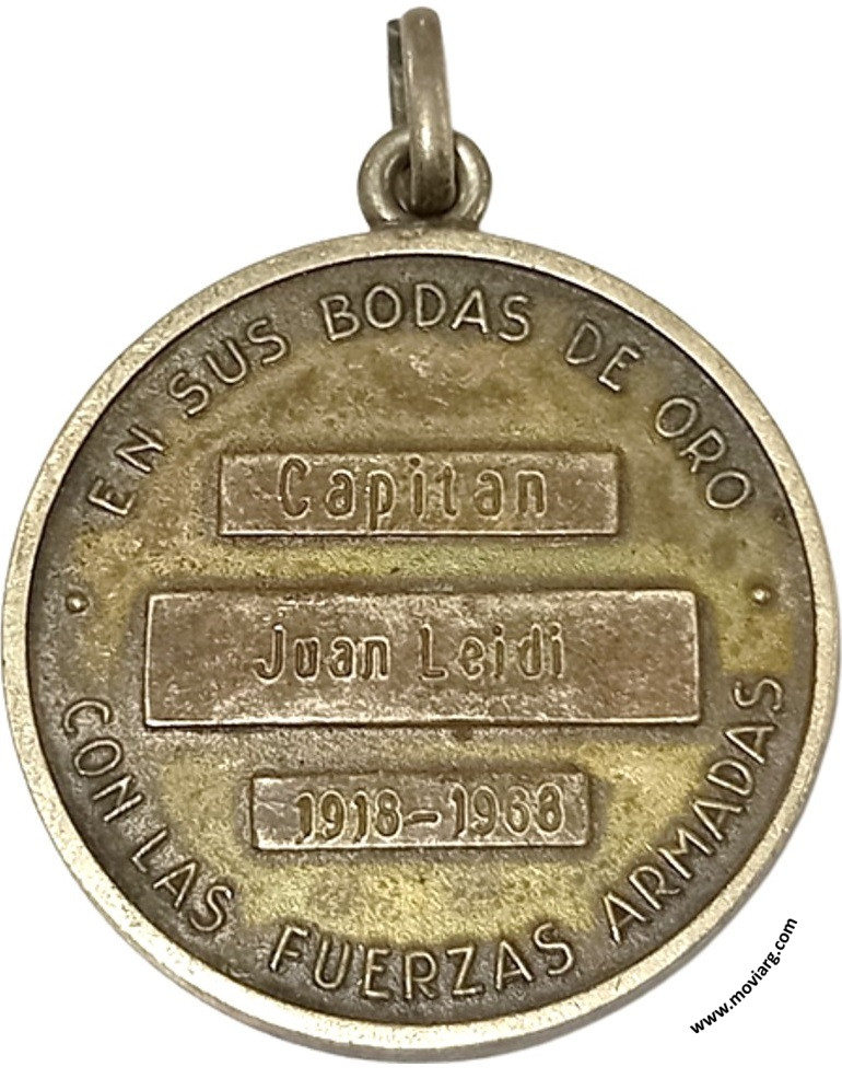 Anverso: ASOC. OFICIALES RETIRADOS / FF. AA. DE LA NACION Reverso: EN SUS BODAS DE ORO / CON LAS FUERZAS ARMADAS / [ CAPITAN ] / [ JUAN LEIDI ] / [ 1918 - 1968 ] Referencia: | |