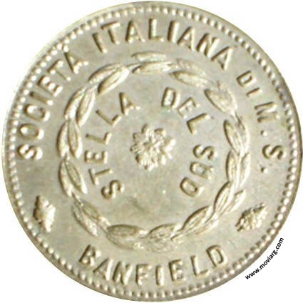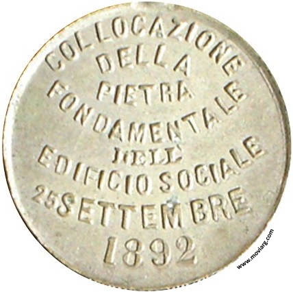 Anverso: SOCIETÁ ITALIANA DI M.S. / BANFIELD / STELLA DEL SUD Reverso: COLLOCAZIONE / DELLA / PIETRA / FONDAMENTALE / DELL / EDIFICIO SOCIALE / 25 SETTEMBRE / 1892 Referencia: | |