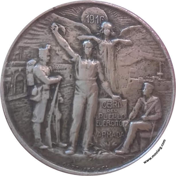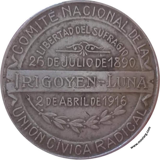 Anverso: OBRA / DEL / PUEBLO / EJERCITO / Y / ARMADA. Campo: 1916. Firma: GOTTUZZO Y CA. Reverso: COMITÉ NACIONAL DE LA / UNIÓN CÍVICA RADICAL / LIBERTAD DEL SUFRAGIO / 26 DE JULIO DE 1890 / 2 DE ABRIL DE 1916 / IRIGOYEN (sic) - LUNA Canto: Liso: M.B. Referencia: BURZIO-153 | |