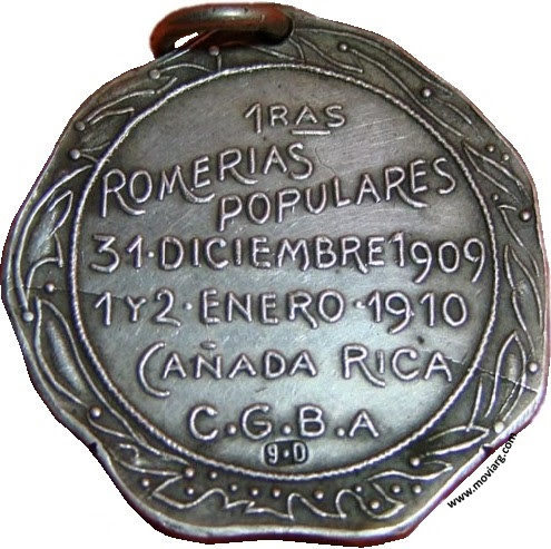 Anverso: Reverso: 1RAS. / ROMERIAS / POPULARES / 31 DICIEMBRE 1909 / 1 Y 2 ENERO 1910 / CAÑADA RICA / C.G.B.A. Exergo: [ 9·D ] Referencia: | |