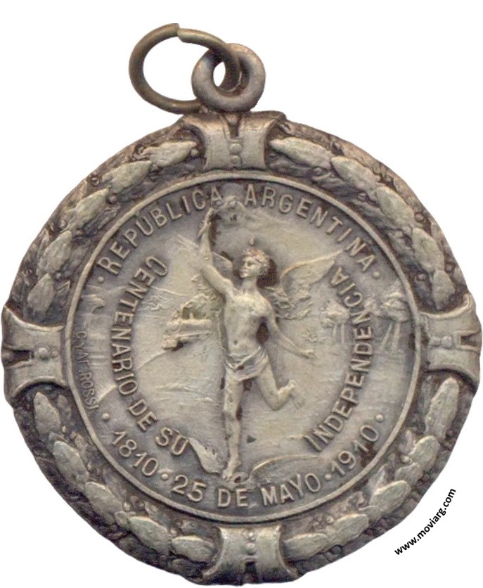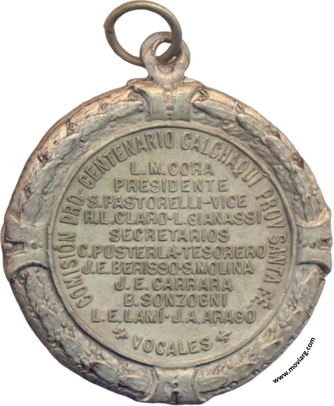 Anverso: REPÚBLICA ARGENTINA / CENTENARIO DE SU / INDEPENDENCIA (sic) / 1810 · 25 DE MAYO · 1910. Firma: C. Y AF. ROSSI Reverso: COMISIÓN PRO-CENTENARIO CALCHAQUÍ PROV. SANTA FÉ / L. M. CORA / PRESIDENTE / S. PASTORELLI - VICE / H. L. CLARO · L. GIANASSI / SECRETARIOS / C. PUSTERLA · TESORERO / J. E. BERISSO · S. MOLINA / B. SONZOGNI / L. E. LAMÍ · J. A. ARAGÓ / VOCALES Referencia: | |