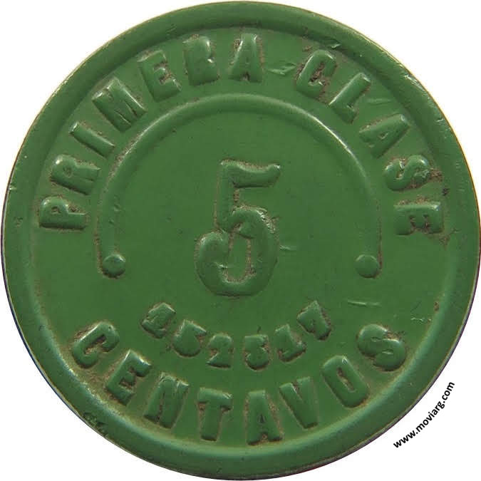 Anverso: PRIMERA CLASE / 5 / CENTAVOS. Campo: 152317 Reverso: FERRO-CARRIL / URBANO / DE / CONCEPCION Referencia: | |