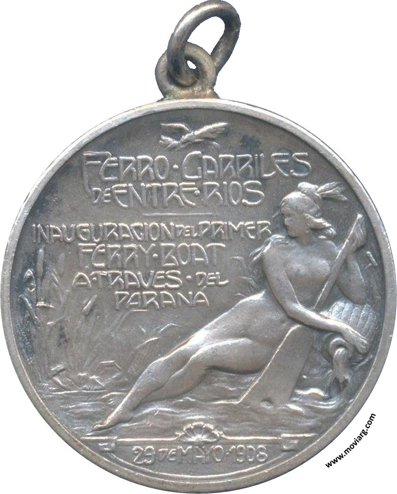 Anverso: Reverso: FERRO CARRILES / DE ENTRE RIOS / INAUGURACION DEL PRIMER / FERRY BOAT / Á TRAVES DEL / PARANÁ / 29 DE MAYO 1908 Canto: Liso. PLATA Referencia: | |