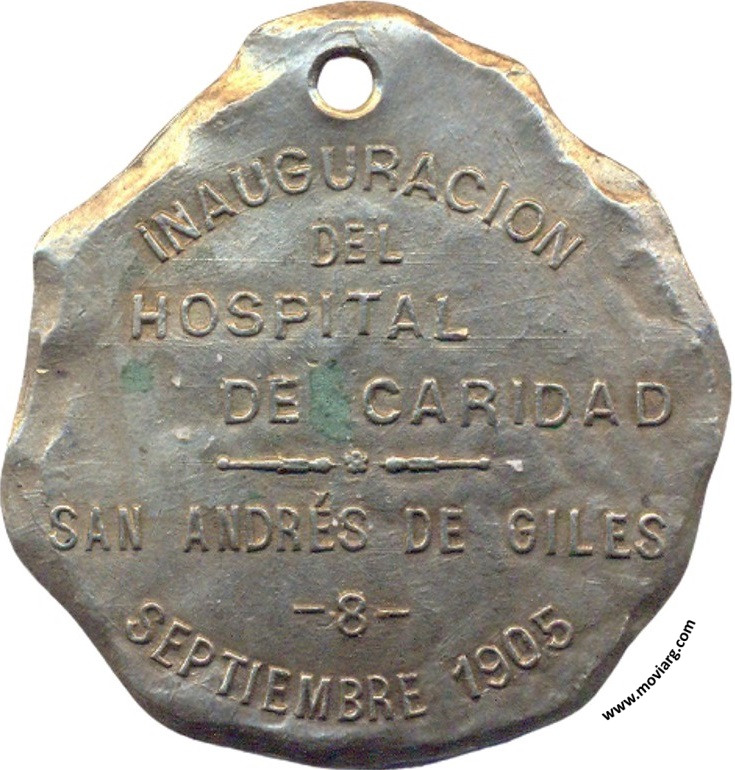 Anverso: COMISION AUXILIAR / DE / DAMAS. Firma: BELLAGAMBA / Y ROSSI Reverso: INAUGURACION / DEL / HOSPITAL / DE CARIDAD / SAN ANDRÉS DE GILES / 8 / SEPTIEMBRE 1905 Referencia: | |
