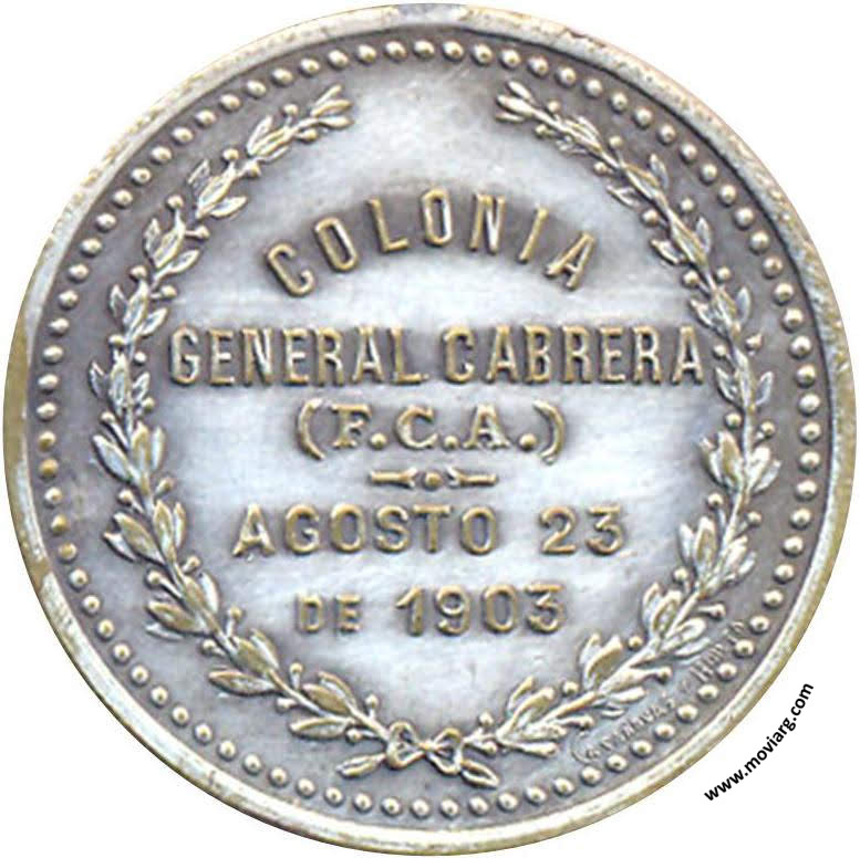 Anverso: BANCO AGRICOLA COMERCIAL / DEL / RIO DE LA PLATA / 1A. EXPOSICION / NACIONAL / DE AGRICULTURA Reverso: COLONIA / GENERAL CABRERA / ( F. C. A.) / AGOSTO 23 / DE 1903. Firma: CASANOVAS Y HORTA Referencia: | |