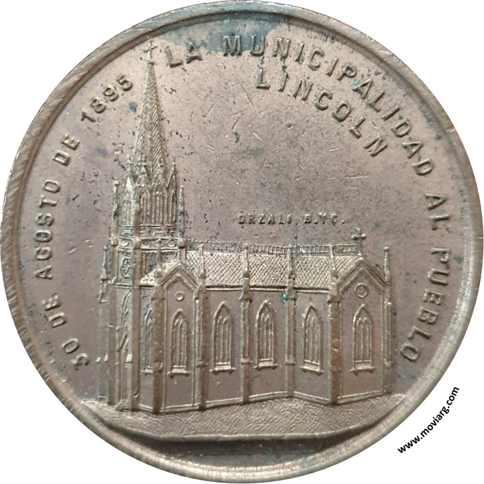 Anverso: 30 DE AGOSTO DE 1895 LA MUNICIPALIDAD AL PUEBLO / LINCOLN. Firma: ORZALI B. Y C. Reverso: COLOCACION DE LA PIEDRA FUNDAMENTAL DEL TEMPLO / PADRINOS / SR. SENADOR DE LA PROVINCIA / ARTURO C. MASSEY / SRA. CLOTILDE G. DE MASSEY / INTENDENTE / SR. CRUZ M. SEIN Referencia: | |