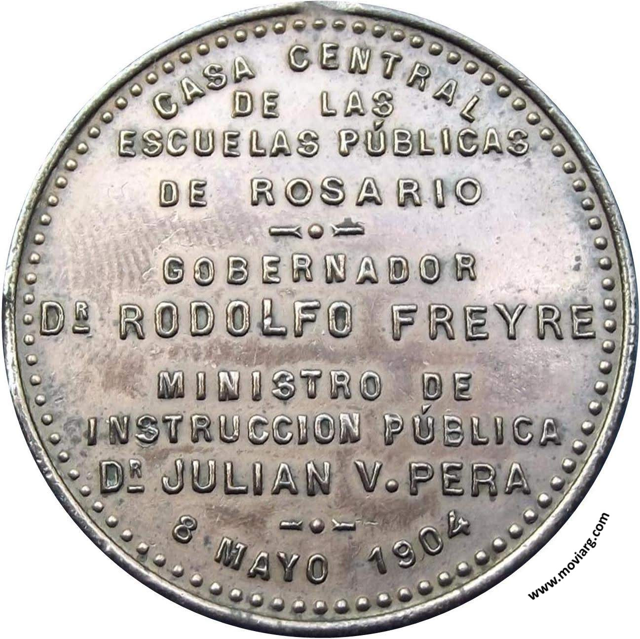 Anverso: PROVINCIA DE SANTA FÉ / EDIFICACION ESCOLAR / LEY N° 1177 Reverso: CASA CENTRAL / DE LAS / ESCUELAS PÚBLICAS / DE ROSARIO / GOBERNADOR / DR. RODOLFO FREYRE / MINISTRO DE / INSTRUCCION PÚBLICA / DR. JULIAN V. PERA / 8 MAYO 1904 Referencia: | |