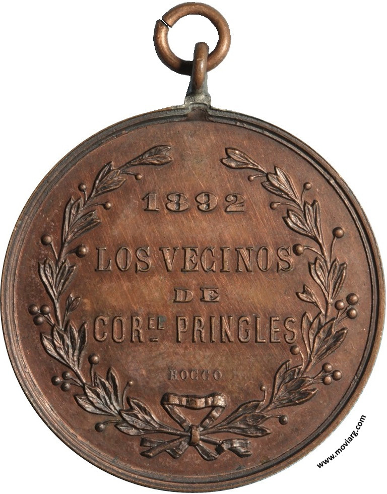 Colección @parryyanumismatico Anverso: AL BENEMERITO CABALLERO DN. JOSÉ CIRIACO GOMEZ / TESTIMONIO / DE / GRATITUD / POR SUS TRABAJOS / EN PRO / DE ESTE / VECINDARIOReverso: 1892 / LOS VECINOS / DE / COREL. PRINGLES. Firma: ROCCO Referencia: | |