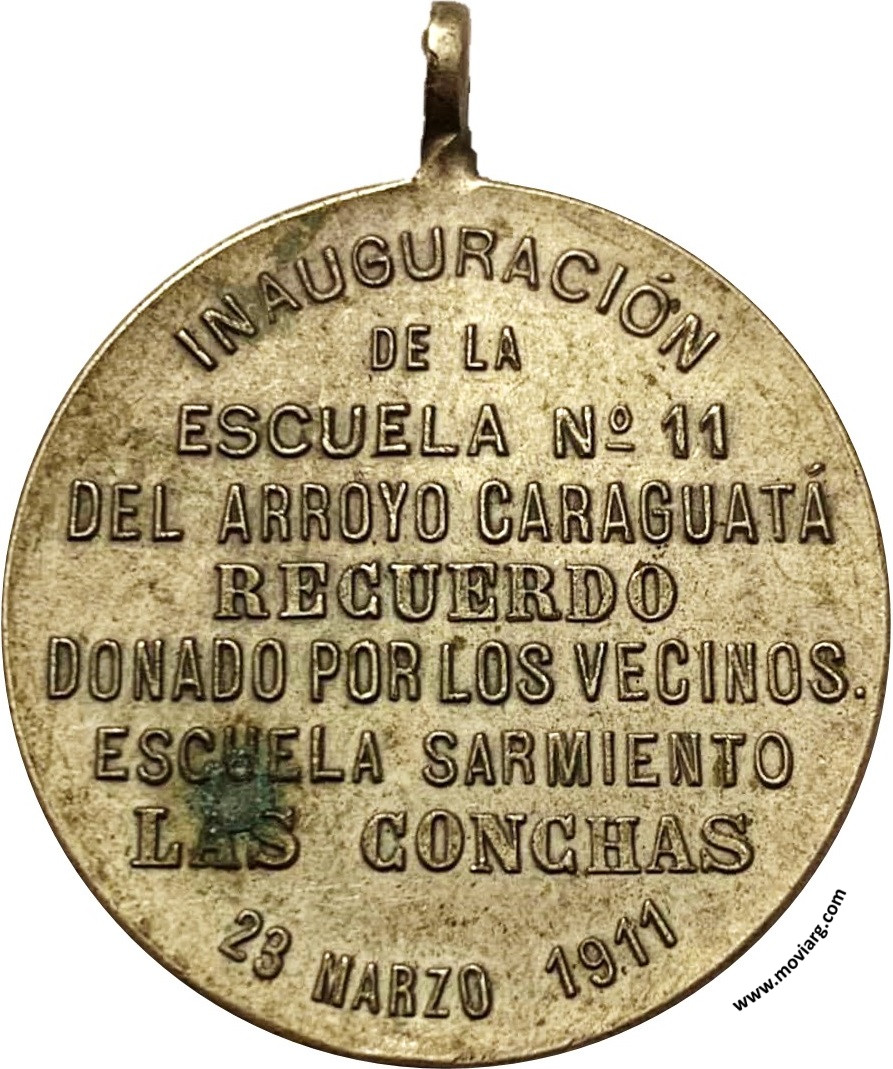 Anverso: Firma: C. Y AF. ROSSI Reverso: INAUGURACIÓN / DE LA / ESCUELA N° 11 / DEL ARROYO CARAGUATÁ / RECUERDO / DONADO POR LOS VECINOS. / ESCUELA SARMIENTO / LAS CONCHAS / 23 MARZO 1911 Referencia: | |