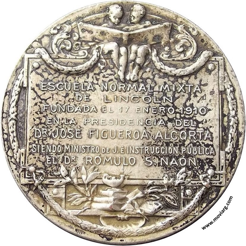 Anverso: "NO HAY REPÚBLICA SIN PUEBLO EDUCADO" Reverso: ESCUELA NORMAL MIXTA / DE LINCOLN / FUNDADA EL 17 ENERO 1910 / EN LA PRESIDENCIA DEL / DR. JOSÉ FIGUEROA ALCORTA / SIENDO MINISTRO DE J. É INSTRUCCIÓN PÚBLICA / EL DR. RÓMULO S. NAÓN Referencia: | |