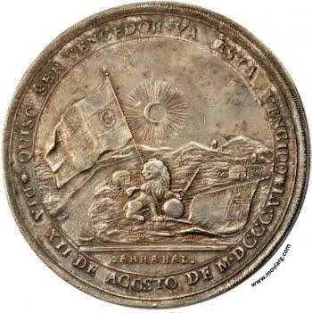Anverso: A CARLOS IIII LA LEALTAD EL AMOR A LA PATRIA Reverso: QUISO SER VENCEDOR YA ESTA VENCIDO / DIA XII DE AGOSTO DE MDCCCVI. Firma: Arrabal Referencia: BURZIO-5358 ROSA-/3 | |