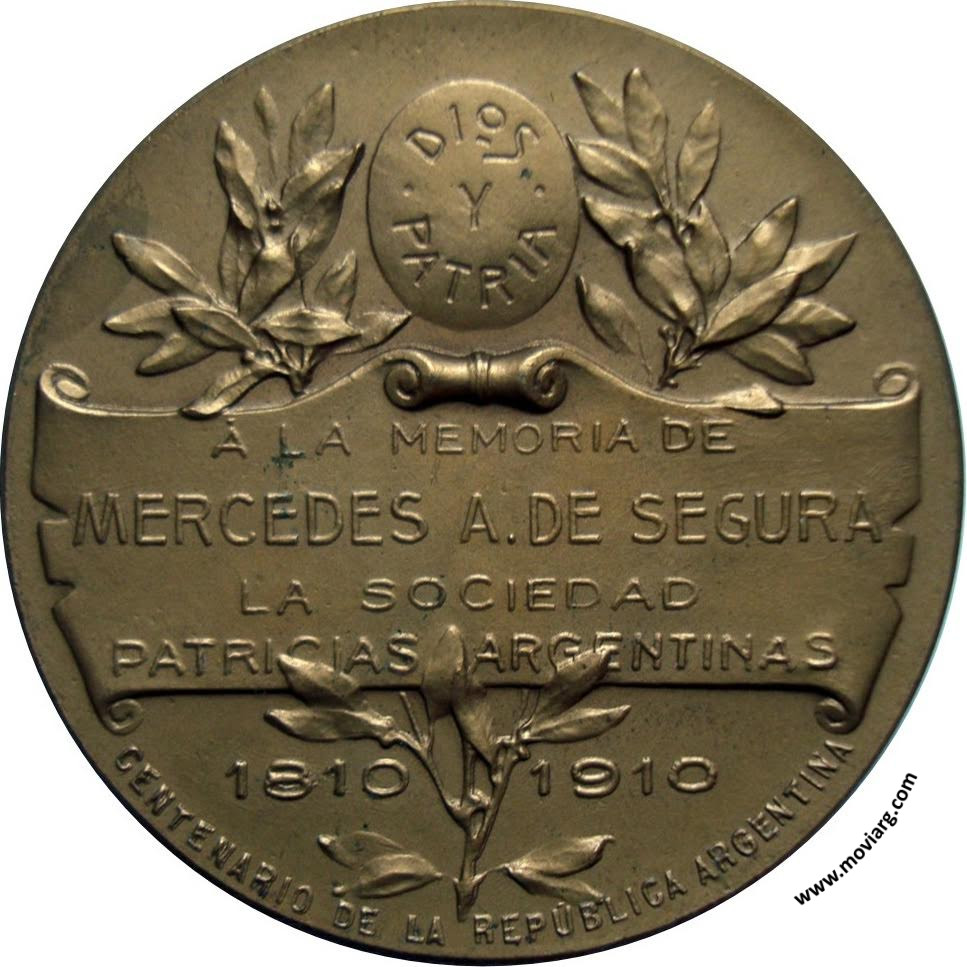 Anverso: 1800 / 1893. Firma: C. Y AF. ROSSI Reverso: DIOS / Y / PATRIA / Á LA MEMORIA DE / MERCEDES A. DE SEGURA / LA SOCIEDAD / PATRICIAS ARGENTINAS / 1810 1910 / CENTENARIO DE LA REPÚBLICA ARGENTINA Referencia: | |