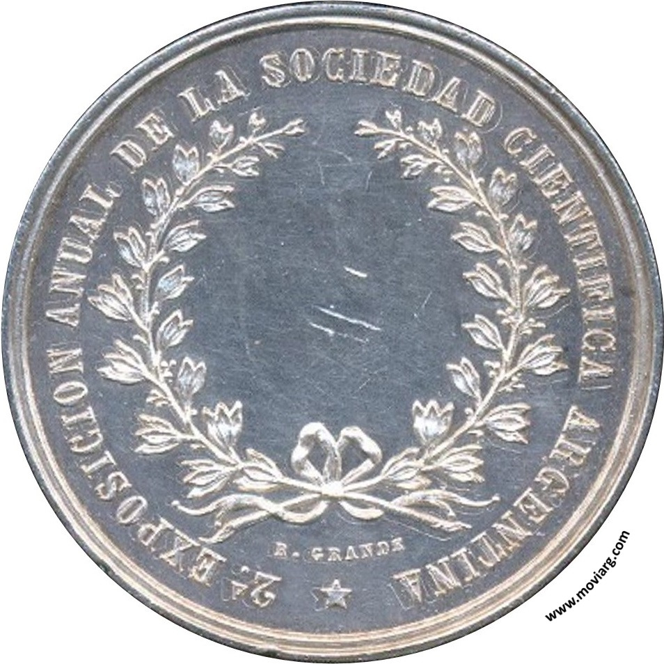 Museo Mitre Anverso: PREMIOS DE ESTIMULO / 1876Reverso: 2A. EXPOSICION ANUAL DE LA SOCIEDAD CIENTIFICA ARGENTINA. Firma: R. GRANDE Canto: Humberto Burzio: "Buenos Aires en la medalla" 1981 p437. Referencia: ROSA-/183 | |
