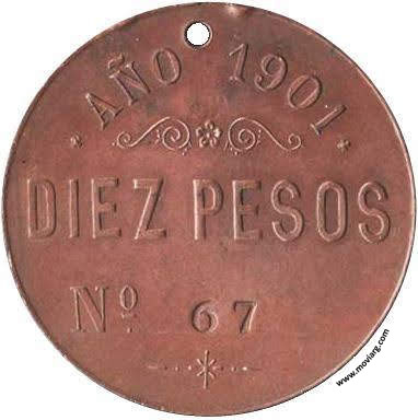Anverso: AÑO 1901 / 10 PESOS / N° [ 67 ] Reverso: PATENTE DE AMBULANTE Referencia: BURZIO-294 | |