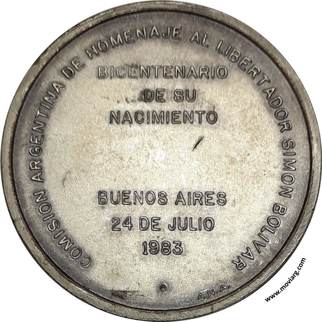 Colección MDS Anverso: SIMON / BOLIVAR / 1783 - 1983. Firma: PIANA BS. AS. / E. BUCCIReverso: COMISION ARGENTINA DE HOMENAJE AL LIBERTADOR SIMON BOLIVAR / BICENTENARIO / DE SU / NACIMIENTO / BUENOS AIRES / 24 DE JULIO / 1983. Firma: A.N.A. Referencia: | |