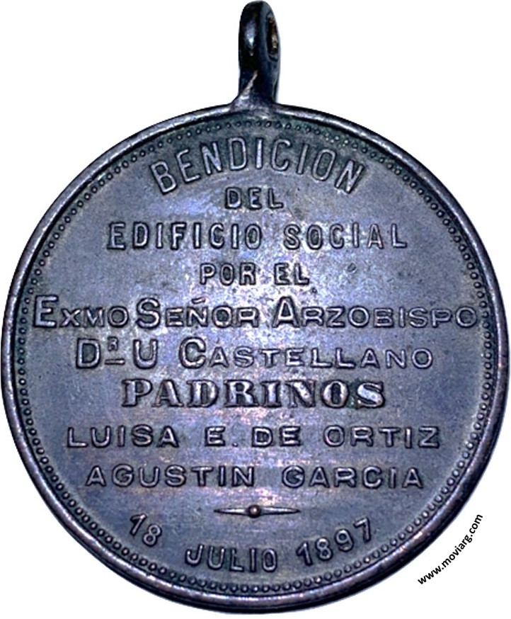 Colección Magnin Anverso: SOCIEDAD JUVENTUD CATOLICA / BUENOS AIRES. Firma: ORZALI B. Y C.Reverso: BENDICION / DEL / EDIFICIO SOCIAL / POR EL / EXMO SEÑOR ARZOBISPO / DR. U CASTELLANO / PADRINOS / LUISA E. DE ORTIZ / AGUSTIN GARCIA / 18 JULIO 1897 Referencia: | |